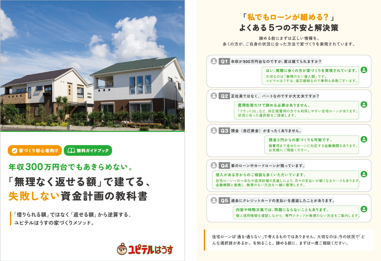 - 資金計画が気になる方へ。無理なく返せる額で進める家づくりの考え方をまとめた教科書です。お客様の声やよくあるお金の質問も紹介しています。